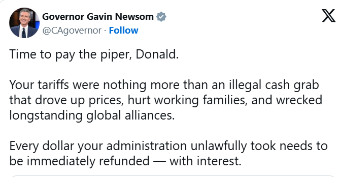 Governor Newsom Insists Trump’s “Tariffs Were Nothing More Than an Illegal Cash Grab That Drove Up Prices, Hurt Working Families, and Wrecked Longstanding Global Alliances,” Demands — “Every Dollar Your Administration Unlawfully Took Needs to Be Immediately Refunded — With Interest”