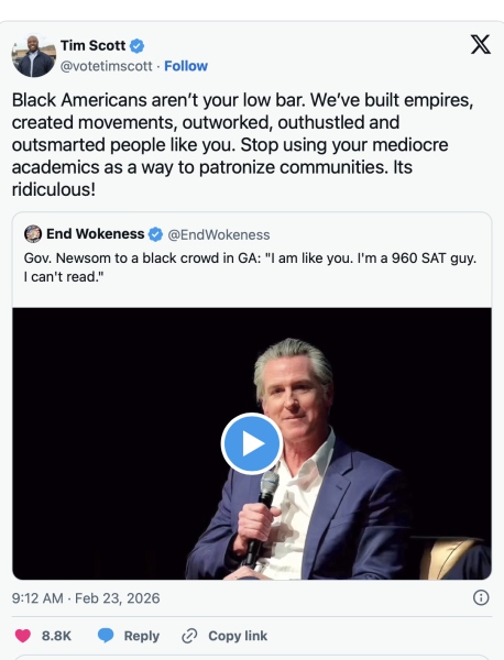 Gavin is saying since he didn't get a great SAT score, and can't read. He is just like the average black person.