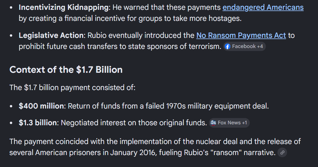 And the 'money' he was talking about, was the $1.7B about to be unfrozen and given to Iran. 400M was the initial payment (ransom) ... thank you Obama. Few tidbits from AI ...