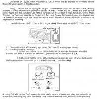 Thanks for all attempts at trying to explain what is wrong. I would like to ask if there are anyone that has any copies of correspondance between Toyota (local, Bangkok, or Japan), consumer groups, or legal advisors and if willing to share with me. With this we would have more ammunition when going to Toyota to tell them that there IS a problem, and they ALREADY know it! I work for some highly influencial people so if I could just get loaded with something more than just my own verbal story and anonymous comments on the internet I might be able to take this further. All I need is just a couple of others with the same problems and the correspondance they have had... not nessessarily solutions, but complaints and descriptions.