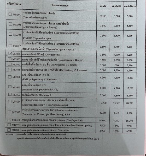 After spending the day doing the first series of tests, my Bride was admitted into the hospital for the night to take the medication that completely clears the GI track, and then have the rest of the tests done the next morning.  By midday the following day after the one night in the hospital, plus meals for both her and me, the total invoice came to ฿35,000 ($1,075 USD), of which TRICARE paid $830 USD (฿26,975).  We had to cover a deductible and a co-pay fee adding up to about 20-percent of the total bill.
