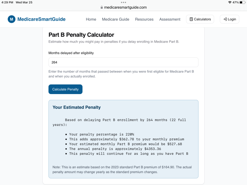 I just calculated my penalty, for sign up, think I'll give that a pass. For those thinking about it: https://medicaresmartguide.com/calculators?calculator=partb