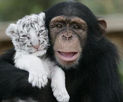 Bet the chimp is thinking, 'Im not looking forward to the day that this little tiger is old enough to feed itself.'
