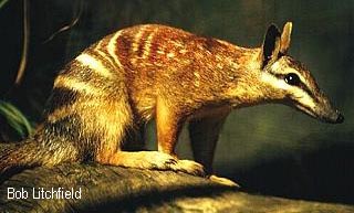 The numbat, also called the Banded Anteater or marsupial anteater, This Australian marsupial mainly eats termites or 'white ants' with its very long sticky tongue. This gentle and squirrel-like solitary animal the Numbat, is active by day, each numbat having its own home range. At night they sleep in a hollow log or under fallen timber. Numbats are slow moving animals that "trot" about with its bushy tail held high.