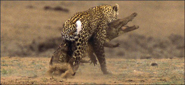 With the crocodile snapping its powerful jaws furiously, the two animals somersaulted and grappled. Despite the crocodile's huge weight and strength, the leopard had the upper hand catching its prey by the throat.
