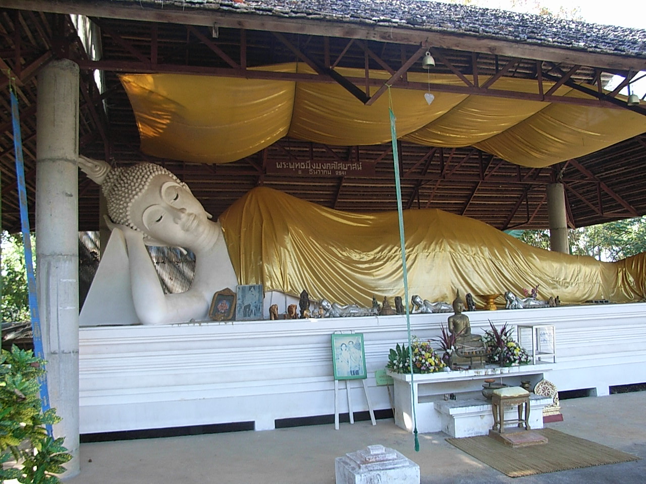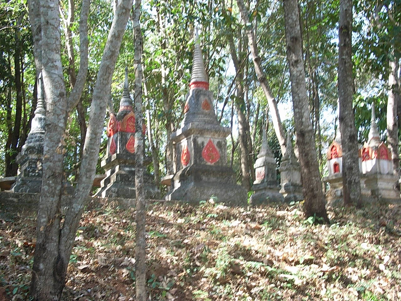 September 18, 200817 yr Near the village is a small steep hill with an old Stupa on it. There's also a relativity new reclining Buddha statue and a dormitory for monks. Nearby is a clump of scrubby trees that is full of spirit houses. The reason for this is the hilltop is infested with phee. I've walked up with the dog many times and he doesn't seem to mind it but earlier this year I decided to drive up and take some photos so took an adult nephew to mind the dog. This great big civilised, sophisticated wuss wouldn't even get out of the car when he realised where we were!!!