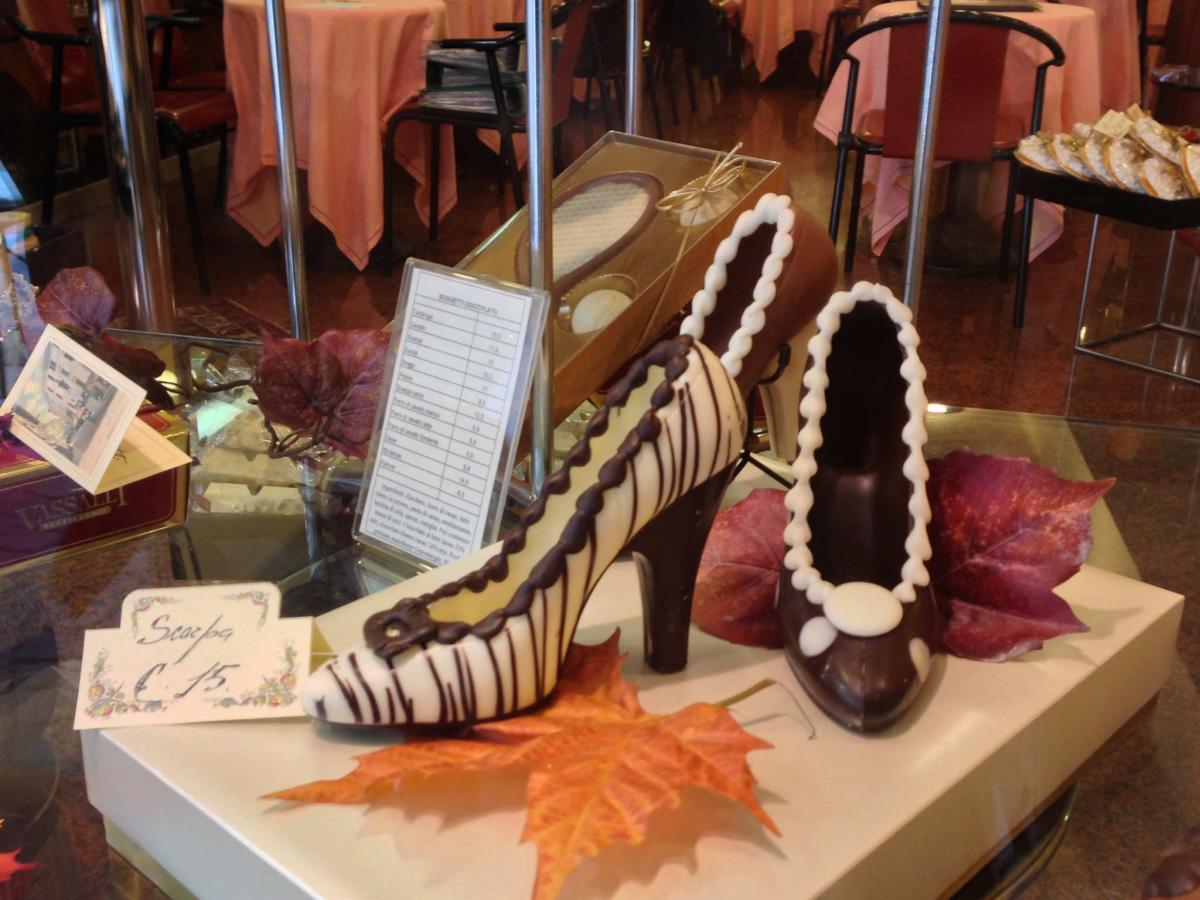Care for a chocolate shoe? Or a racquet? Served at the Cafe Pasticcerie Vassalli on Lake Garda in Italy.