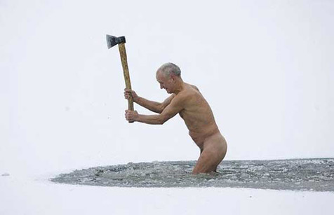 Need to open a piece of ice he thinks, then try and catch some fish.