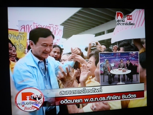 I just finished watching the phone-in on DTV from Khun Thaksin. I don't know where he is. He said he phoned from the airplane. Signal was cut a few times.