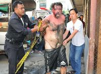 The enraged Australian managed to injure a number of officers before he was finally overpowered, in the process of which he, disturbingly, lost his trousers. The photo of the incident in the Thai press shows the Aussie with his trousers round his ankles, his dignity somewhat spared by a small superimposed red dot.