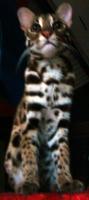 hey the tigger kitty is neither a feline,a cross breed or a half breed for that matter.. he is pure bred cat , not really wild much he has been babied since he was three weeks old ,cared for by human mom and dad with no kitty mom at all since he was three weeks old...but now the tigger leopard cat stands very proud...