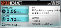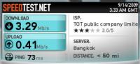 I went to the TOT office Carrfour to pay the bill(don't know why...but did),while there I asked to check their speed.After a little opposition,thy did...BKK speed was astonishing at 6.4 Mbps DN,0.45 Mbps UP,and the international speed(!!!) 2.59 Mbps DN,0.25Mbps UP!!