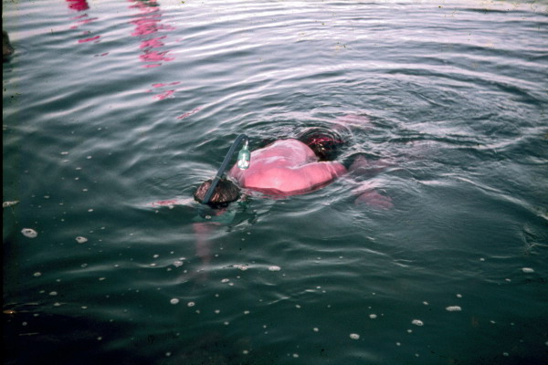 I would also "torch" off the edge of the reef. This was a bit scary because it involved me snorkeling in the water while pulling the canoe along which had the lamp tied to a stick at the bow. The light arc would reach the depths but would not extend very far, so my whole world was a 3 metre hemi-demisphere. Any large fish would only become visible once they were VERY close.