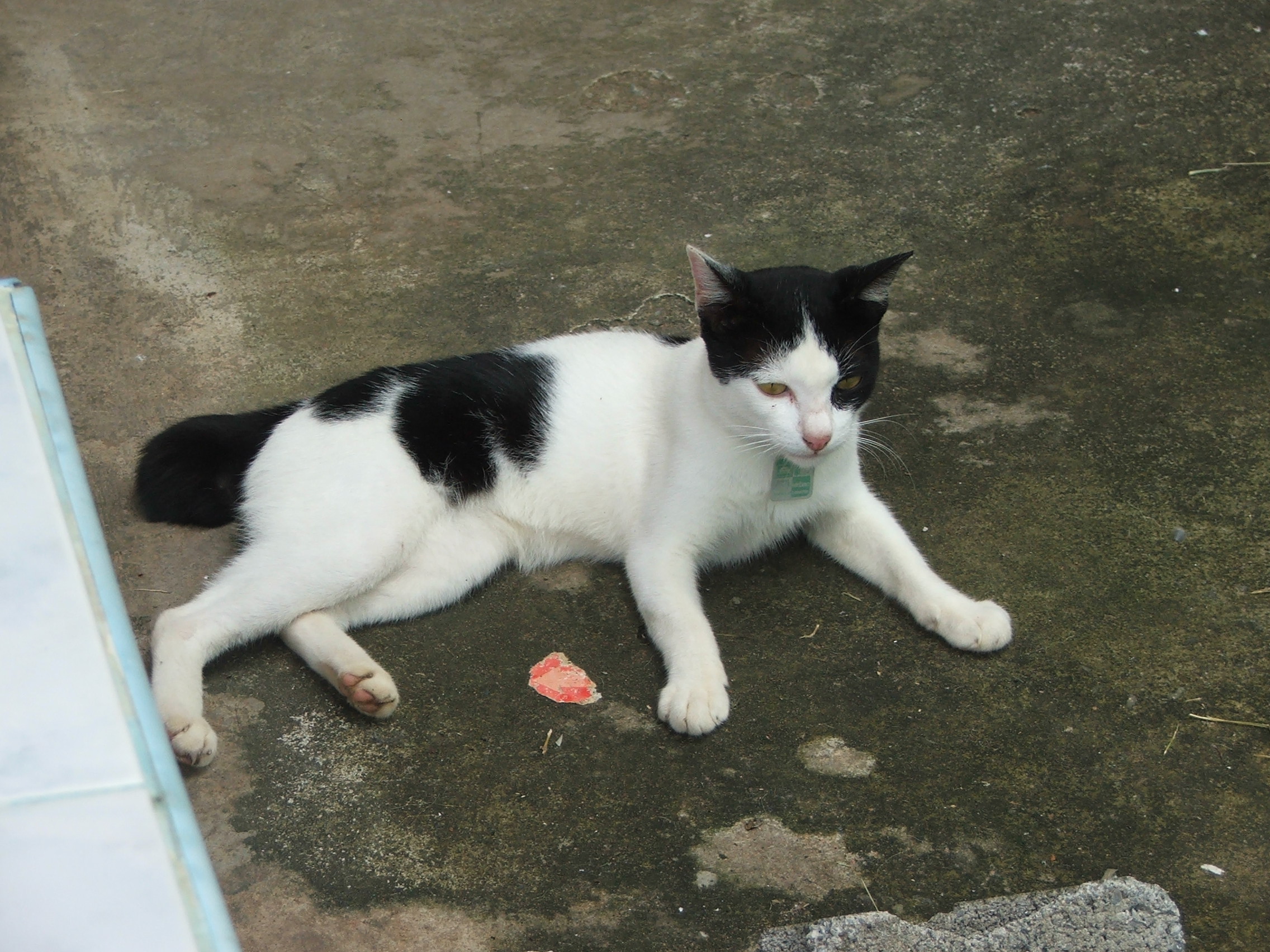 He started hanging around the garden about a week ago. He would mew constantly when I appeared but he shot off if I tried to approach him. He is wearing a collar with a tag, so someone thinks they own him.