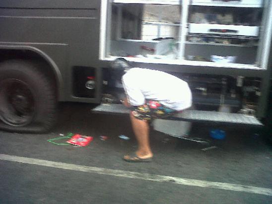 The red-shirt group has hijacked 3 military vehicles close to Lumpinee Park and Sathorn Road. Sand was poured into the gas tank while protesters battered the car with sticks and stones. Reported from TAN