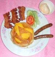 BlueBerry Pancakes with Blueberry and Ice Cream topping. The sausages are just for balance in the food groups... The Maple Syrup.....wellllllll ..... More balance