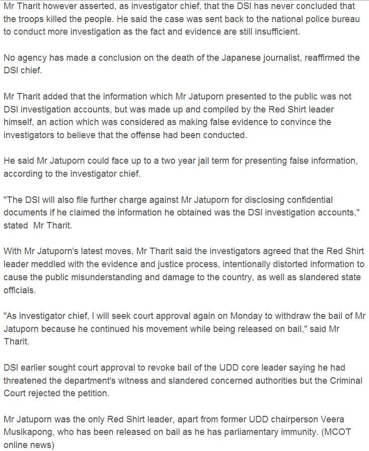 http://www.mcot.net/...age/147344.html . . . . . ."The DSI will also file further charge against Mr Jatuporn for disclosing confidential documents if he claimed the information he obtained was the DSI investigation accounts," stated Mr Tharit. . . . . Does this mean that the leak info is true?