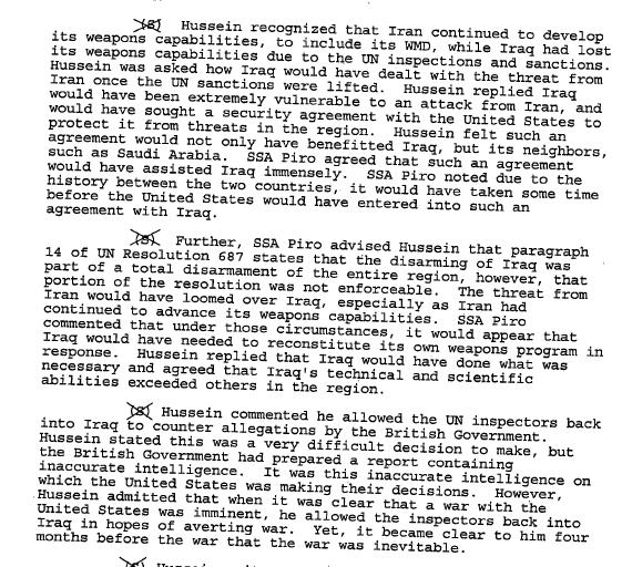 However, the report of the Piro-Saddam interview, released under freedom of information laws, is not quite so clear.