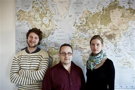 Mads Bjerg (L), founder of the Greenleaks organisation, poses with employees of DanWatch, investigative journalist Morten Hansen © and company director Anne Skjerning, in this handout taken in Copenhagen January 26, 2010.