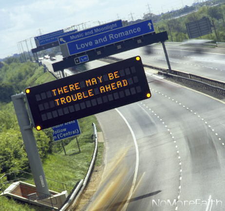 Republican voter permanantly stuck on sidewalk, deeply disturbed that sign does not tell him where to go next, was happy with sign telling him to see the film Poseidon, must call the paramedics