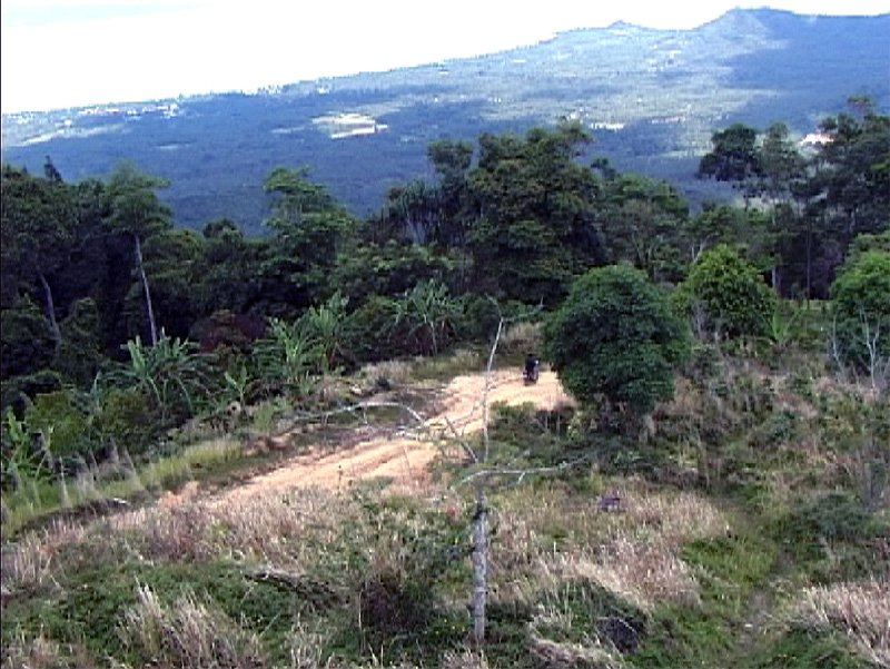 I have a frame showing the road by the – a motorbike is passing – seen from the viewpoint. Deep rails from rain season water, so difficult to drive, but might be different today, or might be same-same...