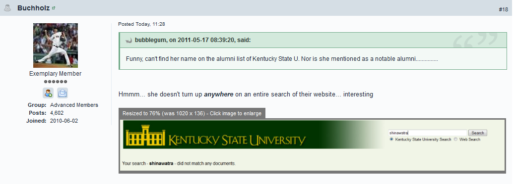 May 17, 201114 yr You've not been shamed enough yet, WinnieTheKwai? Where in the world did you get the notion that my post said anything like what you are changing it to? I said, "interesting" which has somehow morphed deep inside your cerebrum to, "state unequivocally that he doubts that Ms. Yingluck completed her masters degree at this university" What's going on with you? How do you all of that out of a short solitary 4-syllable word? .... and then go on to post, "that's certainly what it looked like".... geez, get glasses if you think they look alike. Try and reign in that imagination of yours that creates secret meanings are behind what posters are actually writing. It'll save you from embarrassment. This is what you wrote, I include a screen shot below. So that we may all gain an understanding of the point you were making, I'm asking you point blank, "What do you mean by it? Why is this interesting?" Now you have it as an open question. And please stop your abusive tone, it won't help the discussion. I answered it many hours ago. I simply found it interesting. It was only mildly interesting, at that, hence the paucity of words in my post. Having seen some reference to many alumni on a multitude of university websites, it was just curious that there was not a mention of her for any reason. As the typical example that I provided as proof, even relatively minor achievements are noted on the KSU website, (not to take anything away from being promoted head of the local Girl Scouts). Your dark conspiracies of it somehow translating into a smear or "slander" as you ridiculously called it and for it to somehow morph its meaning into she didn't graduate there are just within your own over-active imagination. Trying to ascribe treachery to something as simple as a passing comment of "interesting" is really such a stretch. btw, your own "abusive tone" by leveling the absurd charge of "slander", etc. is what initiated things. Have you still not looked in the mirror after your earlier ridiculousness were disproven following the proof I posted twice which disproved both of your assertions about university website content information? Your own inaccuracies, such as asserting there's no Smith, Jones, or Williams to be found at KSU, were found out easily. In the end it's simple. Don't read into people's post more than what they write, especially if your fantasizing is going to result in long, drawn out discourse and leveling of absurd charges. Here's hoping you don't feel the need to ground this even further into the ground than you already have over a single word posted. Now that is truly "interesting." Next. .
