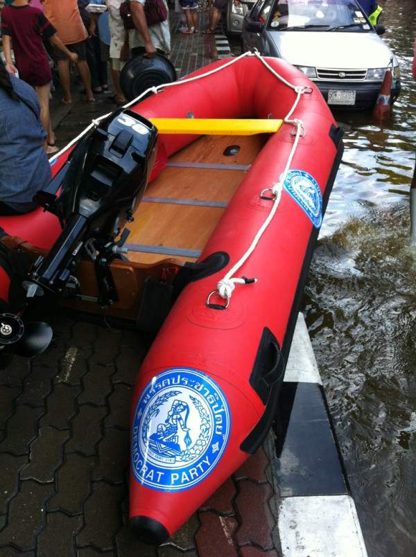 There are many organizations that label their relief supplies, which is normal in any disaster zone. On the ground is so much happening, and i do honestly not see that much going on as is suggested here. Maybe i am in the wrong places for that, as i go to the worst inundated areas to take pictures there. I have met there many Red Shirts, both affected, and helping, and there just is not much political talk going on at all, but talk about the flood, and trying to keep a smile to get over this mess.