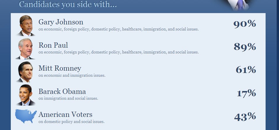 What I showed was my original results. I only did the test once. I chose my own stance I think once for only one issue as part of the original poll. Of course liberals agree with libertarians about half way. My results showed that perfectly. I was surprised I was so high for the Green Party. I suppose I am more of an environmentalist than I had realized.
