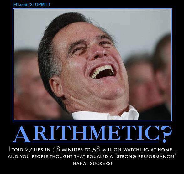 Lies? They are both politicians. I'm sure they both told some lies or at least misled at one point. The thing is, in a live debate in front of nearly 100 million people worldwide, you have to be knowledgeable and quick thinking in order to respond to what your opponent says, and you need to be careful that any lie you tell will be picked up on by your opponent and thrown back at you. Romney did this with Obama's comment about businesses can claim a deduction for moving a plant overseas. He did it other times as well. But according to your picture, Romney told 27 lies yet the man standing next to him, arguably the most brilliant man ever to be President, the greatest orator of our time, was unable to respond to any of them. Why not?
