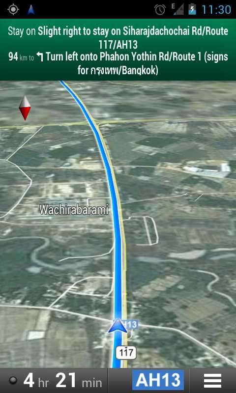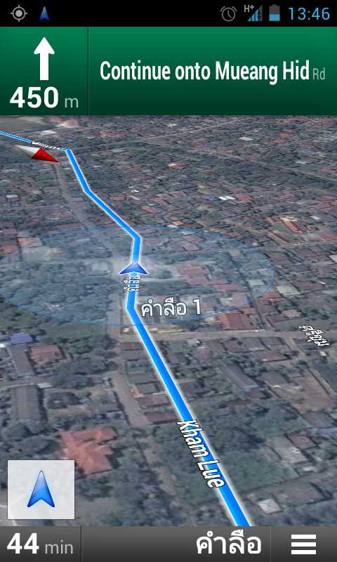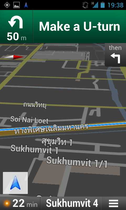 Google Maps with turn-by-turn Navigation (with re-routing and voice-assist) provides text directions in both English and Thai, while the spoken assistance is in English, with amusing pronunciations.