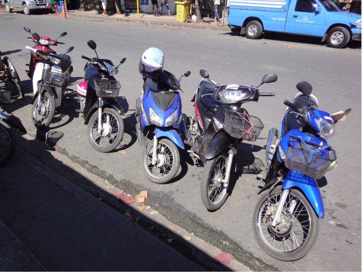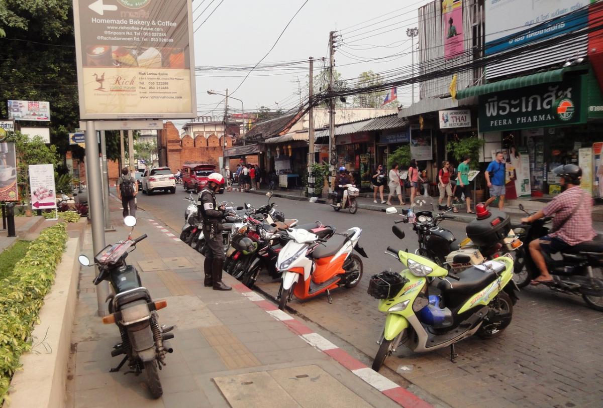 Last week I stop with my scooter in front of Starbucks Coffee on Tape Gate, there was a lot of bikes staying so I park in line next to the last one. After I come back, all bikes are gone, just mine stays there with a chain around the bike and a 400 THB ticket. I did not know the red/white lines on the street border are meaning no parking zone.