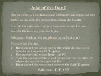 August 29, 201213 yr Popular Post This is a true story from the WordPerfect Helpline, which was transcribed from a recording monitoring the customer care department. Needless to say the Help Desk employee was fired. Actual dialogue of a former WordPerfect Customer Support employee: Operator: ‘Ridge Hall, computer assistance; may I help you?’ Caller: ‘Yes, well, I’m having trouble with WordPerfect.’ Operator: ‘What sort of trouble?’ Caller: ‘Well, I was just typing along, and all of a sudden the words went away.’ Operator: ‘Went away?’ Caller: ‘They disappeared’ Operator: ‘Hmm. So what does your screen look like now?’ Caller: ‘Nothing.’ Operator: ‘Nothing?’ Caller: ‘It’s blank; it won’t accept anything when I type.’ Operator: ‘Are you still in WordPerfect, or did you get out?’ Caller: ‘How do I tell?’ Operator: ‘Can you see the ‘C: prompt’ on the screen?’ Caller: ‘What’s a sea-prompt?’ Operator: ‘Never mind, can you move your cursor around the screen?’ Caller: ‘There isn’t any cursor; I told you, it won’t accept anything I type.’ Operator: ‘Does your monitor have a power indicator??’ Caller: ‘What’s a monitor?’ Operator: ‘It’s the thing with the screen on it that looks like a TV. Does it have a little light that tells you when it’s on?’ Caller: ‘I don’t know.’ Operator: ‘Well, then look on the back of the monitor and find where the power cord goes into it. Can you see that?’ Caller: ‘Yes, I think so.’ Operator: ‘Great. Follow the cord to the plug, and tell me if it’s plugged into the wall.’ Caller: ‘Yes, it is.’ Operator: ‘When you were behind the monitor, did you notice that there were two cables plugged into the back of it, not just one? ‘ Caller: ‘No.’ Operator: ‘Well, there are. I need you to look back there again and find the other cable.’ Caller: ‘Okay, here it is.’ Operator: ‘Follow it for me, and tell me if it’s plugged securely into the back of your computer.’ Caller: ‘I can’t reach.’ Operator: ‘OK. Well, can you see if it is?’ Caller: ‘No.’ Operator: ‘Even if you maybe put your knee on something and lean way over?’ Caller: ‘Well, it’s not because I don’t have the right angle – it’s because it’s dark.’ Operator: ‘Dark?’ Caller: ‘Yes – the office light is off, and the only light I have is coming in from the window.’ Operator: ‘Well, turn on the office light then.’ Caller: ‘I can’t.’ Operator: ‘No? Why not?’ Caller: ‘Because there’s a power failure.’ Operator: ‘A power … A power failure? Aha. Okay, we’ve got it licked now. Do you still have the boxes and manuals and packing stuff that your computer came in?’ Caller: ‘Well, yes, I keep them in the closet.’ Operator: ‘Good. Go get them, and unplug your system and pack it up just like it was when you got it. Then take it back to the store you bought it from.’ Caller: ‘Really? Is it that bad?’ Operator: ‘Yes, I’m afraid it is.’ Caller: ‘Well, all right then, I suppose. What do I tell them?’ Operator: ‘Tell them you’re too stupid to own a computer!’
