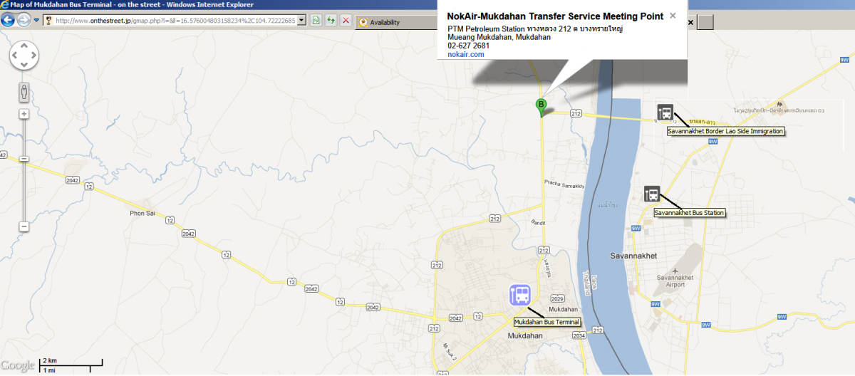 Here's a map I've cobbled together showing the two Bus Stations either side of the Mekong River. The nice new Goverment bus goes from Mudahan bus station to Savannakhet bus station using the Friendship Bridge #2... Chancing it; I hope to board this bus at the Thai border (not at its regular departure point) as I read that it's possible to buy a ticket near the Thai Immi office.