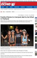 June 19, 201312 yr Family tributes to Liverpool dad-to-be killed in ThailandDarren Taylor in Thailand. Photo: liverpoolecho.co.ukBANGKOK: -- Darren Taylor, 34, originally from Walton, died in Bangkok with his family saying he had been pushed from the balcony of the sixth-floor flat where he was livingA Liverpool man killed in Thailand had been looking forward to becoming a dad for the first time, his family said.Darren Taylor, 34, originally from Walton, died in Bangkok on Thursday.His family said he had been pushed from the balcony of the sixth-floor flat where he was living.Parents Linda and Gary said police officers told them a man from Bootle had been arrested at the scene and was being held by Thai police.Darren, a former Childwall School pupil, had been living in the country for three years with a Thai girlfriend who was four months pregnant.Speaking from the family home in City Road, Walton, mum Linda said: “He was made up about the baby, he was delighted.“The last text we had from him was on the Wednesday and he was telling us he was going to bring up a beautiful baby. That was the day before he was murdered.“He was so happy and he was so much in love.“He’d always had a stream of girlfriends and he’d finally met someone, his girlfriend Dao, who he really loved.“Last time I spoke to him on the phone he said to me ‘I love you loads mum and tell my dad I love him loads too’.”Full story: http://www.liverpoolecho.co.uk/news/liverpool-news/family-tributes-liverpool-dad-to-be-killed-4450766 -- LIVERPOOL Echo 2013-06-19