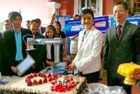 A robotic arm, an innovation by Reed Tradex Company that was being displayed alongside other science projects, was waiting for Ms. Yingluck next to the cake.