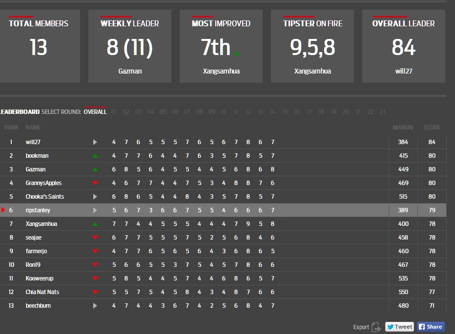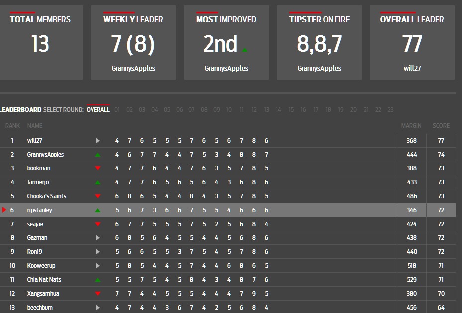 Tipping comps going to be wide open! Anyone can win that except probably khun beechbum who's some 10 points behind the hansum man khun Will27...