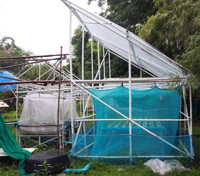 To the left of greenhouse is the AP system, this is almost three years old. The plastic needs to be redone. Despite being drenched by moonsoon rains, the bamboo still holds up fine after almost three year.