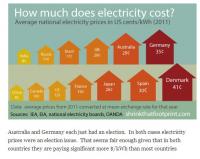 Since a barrel of oil or cubic feet of natural gas pretty much sells to any country at the same price and adding in some transportation costs, energy prices by country vary greatly primarily due to "taxes added by the govt." Below is a 2011 report graphically showing electricity cost by certain countries...Thailand is not on the graph but for residential electricity costs in Thailand (including basic cost, energy fee, and taxes) the average cost is approx Bt4.8 per Killowatt Hour (KWH) or about 15 U.S. cents/KWH....this puts Thailand electricity energy costs a little higher that the U.S cost of 12 cents/KWH but way below countries like Australia at 29 cents/KWH. Note: some condo residents/renters which do not have their electric service in their name with the electric company pay more because the condo/landlord ups the price.