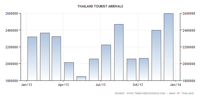 Well your right. The political situation changed on the 20th of May. It went from daily terrorist attacks in the capital of the country to nothing. When visiting a country do you prefer to visit when there is daily terrorist attacks in the capital or when there is peace and stability? Well going by the below graphs tourists don't like visiting when the capital is rocked with daily terrorist attacks. Numbers dropped quicker than a one armed, blind, drunk rock climber with no safety harness during these daily terrorist attacks compared to 2013. June has seen drop of 27% as well which is no surprise because of the uncertainty of a military take over. Jeez, even I was worried. I put my condo on the market to sell it ASAP. Economic indicators dropped as well. Then we saw the stability and confidence return all the economic indicators bounced back up. I took my condo off the market and things are looking good again.