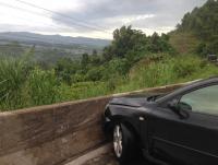 (I was going into a downhill leftward bend and the back of the car swung to the right - of course I didn't keep my head and swung the steering wheel right round to the right - ending up hitting the barrier at the left pretty much a right angles. Scary, because this was a very sharp and big, i.e. fatal, drop and what's worse there would have been a barrier at all in another 40 yards down the road.)