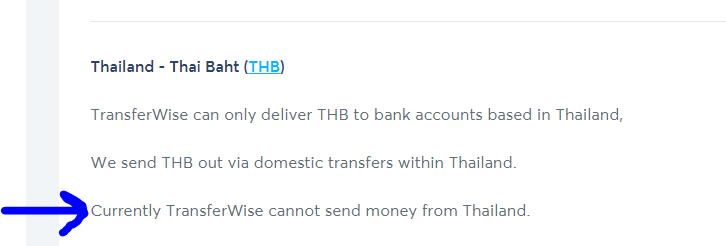And actually the Transferwise basic fee for sending from EURO or GBP is 0.5% vs 1% if I understand the Transferwise website correclty...they are using a different pricing model for the U.S. Expect they are incurring some additional costs in the U.S. to get the money sent out like probably having to use/pay a correspondent/intermediary bank...hard telling. And as mentioned earlier there may be an additional 6GBP/6EUR fee on top of the 0.5% if Transferwise must use SWIFT to get the transfer from the European area to Thailand. They don't seem to mention such an additional fee for transfers from the U.S....maybe that fee is why a 1% fee applies for the U.S. vs 0.5% for the European area.