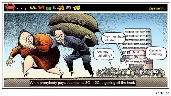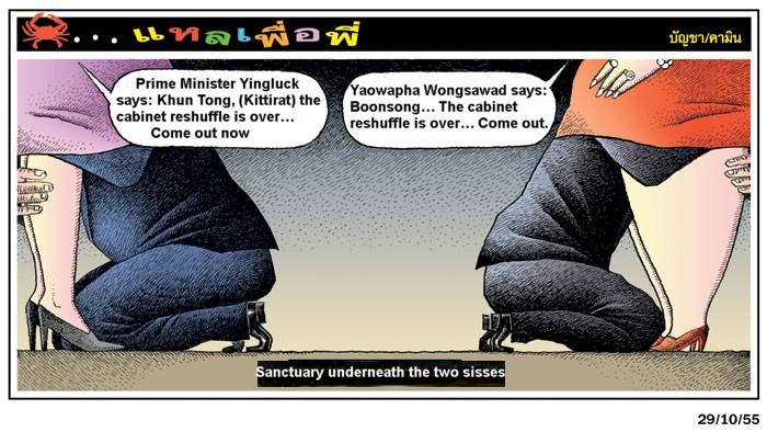 March 19, 201510 yr From October 29, 2012 This refers to the Thai idiom that says wimpy men hide under the skirts of powerful women for protection. Here two ministers are thought to owe their continuing jobs in government to their loyalty to key Shinawatra relatives. The “two sisses” refers to Thaksin’s sisters PM Yingluck Shinawatra and his elder sister Yaowapha Wongsawad, who is believed to be the most powerful person in the Phua Thai Party after Thaksin From October 25, 2012 The woman is Yaowapa Wongsawad, Thaksin’s sister, and a major force in the government. The man carrying rice bags is Commerce Minister Boonsong Teriyapirom. The 3G auction was criticized for allowing several major companies to collude on bidding.In the cartoon, “2G” refers to the “government-to-government” rice trading deals Boonsong claimed he has made. He refused to provide any details of the deals claiming that it would compromise the deals. Many are suspicious as to whether the deals really exist.