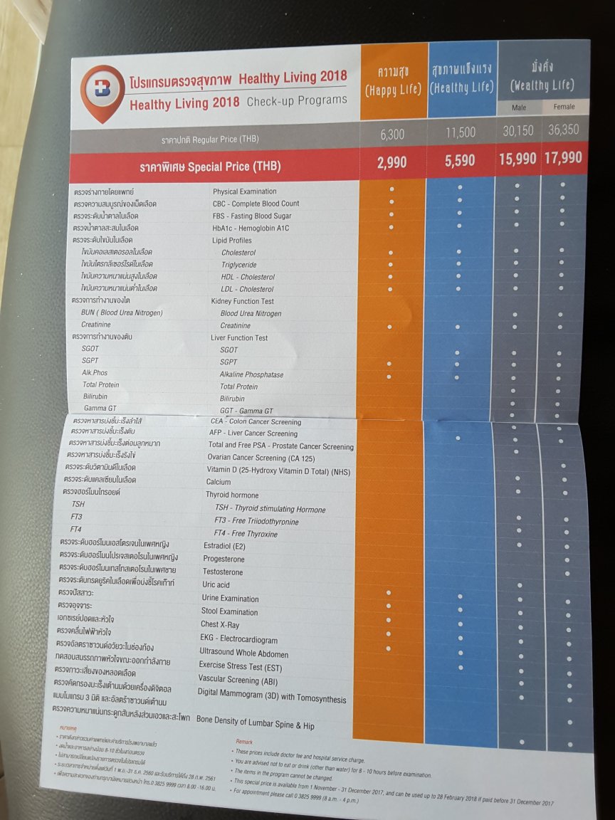 This will show you exactly what 20 items are included for 999 Baht, which includes EKG. They offered it to my Mrs 3 days ago, so they must be rerunning it as a 10 year promotion or whatever.
