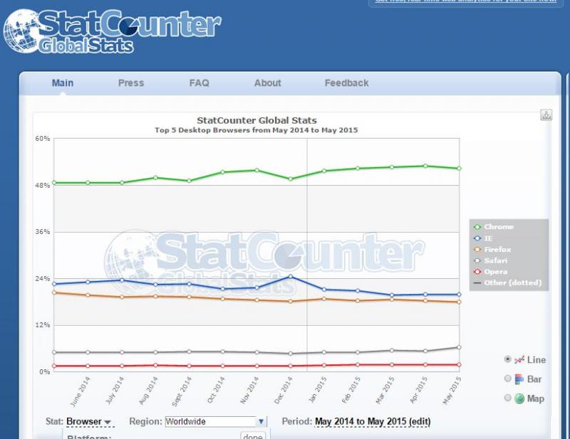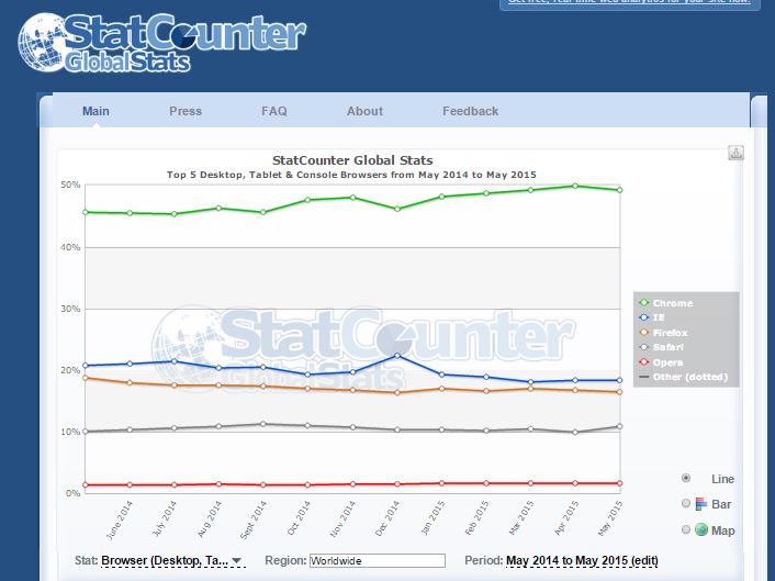 According to StatsCounter, below snapshot shows worldwide market share for the last 12 months for the top five browsers being used on PCs/Tablets/Consoles.