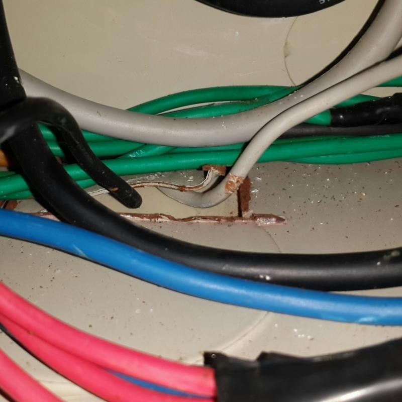 This white wire was cut by a very sharp edge of he distribution unit. It looks as though the worn or cut part did not