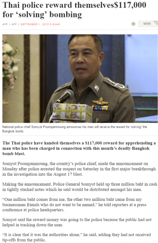 2. The reward, if it was going to be paid, should have been paid to the lady who provided the tip about multiple rooms rented to Turks in her Nongchak apartment building. RTP merely stumbled across a remnant of an ISIL human smuggling operation, that had decided to exact revenge on the junta for the deportation of some of its Uighur brothers.