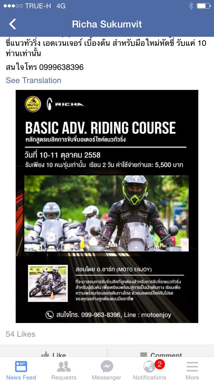 September 22, 201510 yr Where can i learn to ride a big bike? Do people give lessons? No one ever taught me even though i come from a family of harley enthusiasts There is a Honda training centre in Ramkamhaeng road, I have seen videos on YouTube .. I'm not too sure on language tho'. I'm sure they have bikes that you can use. One thing I wanted to do was learn about off-road, kawasaki do weekends but you need your own enduro bike. I also saw this the other day on FB, looked interesting for me, but it's in Bangkok and is 5,500 for 2 days.