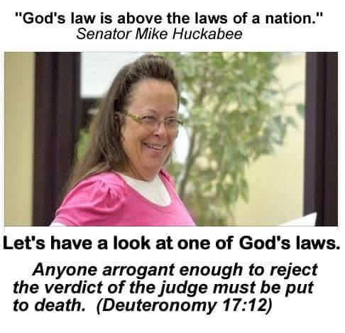 Another example of Christian fanaticism (I'm Christian by the way); how do people like this get elected in the first place? same goes for Bush; stupid voters I guess. I'm sure she had to take an oath of office to "uphold the law", plus, the Bible says to obey the law. So, she is a hypocrite as well as a bitch.