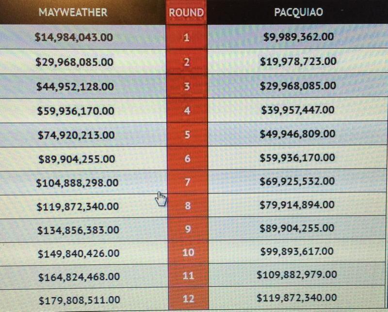 .... here's what Mayweather and Pacquiao earned with the passing of all 12 rounds (Per Round Payouts based on $180M/$120M split):