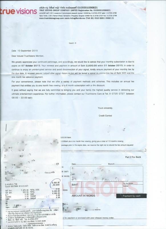 As you can see from the attached letter from True Vision it just states "We Would like to advise that your monthy subscription is due to expiry on the 07 th of October , Your renewal and payment in amount of Baht 2.000.00 within 01 October 2015 .In order to continue to enjoy an uninterrupted service " But its much better that I paid 4 months 4 x 2 = 8.000.00 .